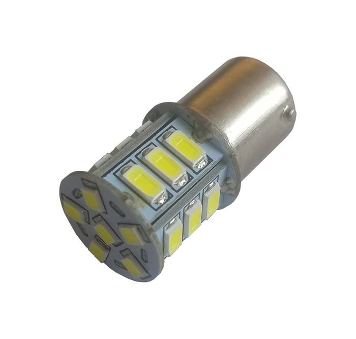 21-ledinen, valkoinen, keltainen tai punainen LED-polttimo yksinapaisella BA15S-kannalla (P21W/1156). Haitat samalla korkeudella ja 180-asteen välein. Valitse väri tuoteoptioista. Myydään kappaleittain.