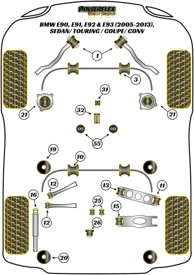 PFF5-4020BLK and PFF5-4021BLK Engine Mount Insert Kits are an intermediate alternative to the BMW Motorsport aluminium inserts and much stiffer full replacement engine mounts available on the aftermarket. Made in our Black 95A durometer material, they are designed to fit the voiding of the OE mounts snuggly to restrict engine movement, perfect for those with tuned track cars. Their design and flexibility also mean they can be fitted to the vehicle without removing the engine mounts themselves. Reducing engine/transmission movement by way of upgraded inserts has the following benefits: – Sharper throttle response – Improved gear shifting – More direct power transfer – More balanced on/off throttle handling – Prolonged life of the OE mounts. A small increase in NVH, usually at idle, should be expected when stiffening the connecting mount between the engine and chassis. The harder the material used, the greater the NVH transmitted. Fits N52, N54, N55 and B58 engines only.