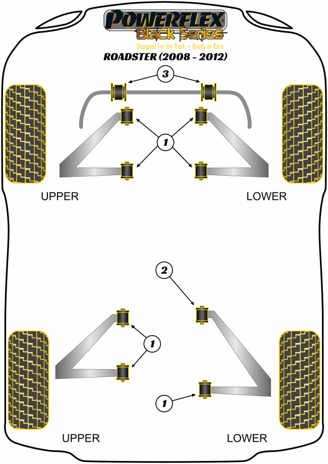 The PF34-1001BLK fits all positions on the Front and Rear wishbones except for the Rear Lower Front Bush which uses PFR34-1002BLK. This part provides an extra 25% stiffness over our previous offerings, reducing distortion and improving wishbone control whilst retaining compliance.